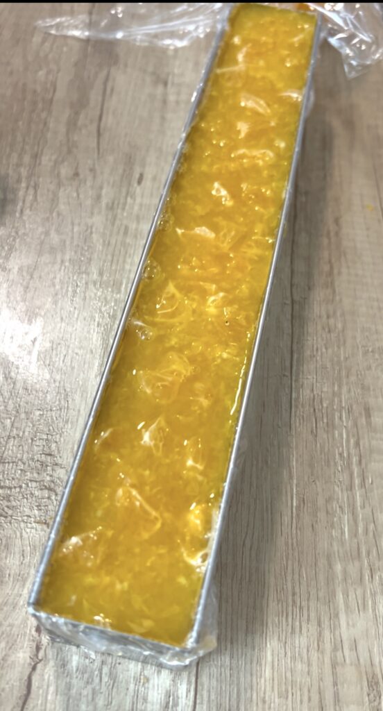 Hors du feu , ajouter les 2 feuilles gélatine et mélanger . Verser la compotee dans une gouttière à bûche de diamètre 4cm ou un moule à insert. Et réserver au congélateur